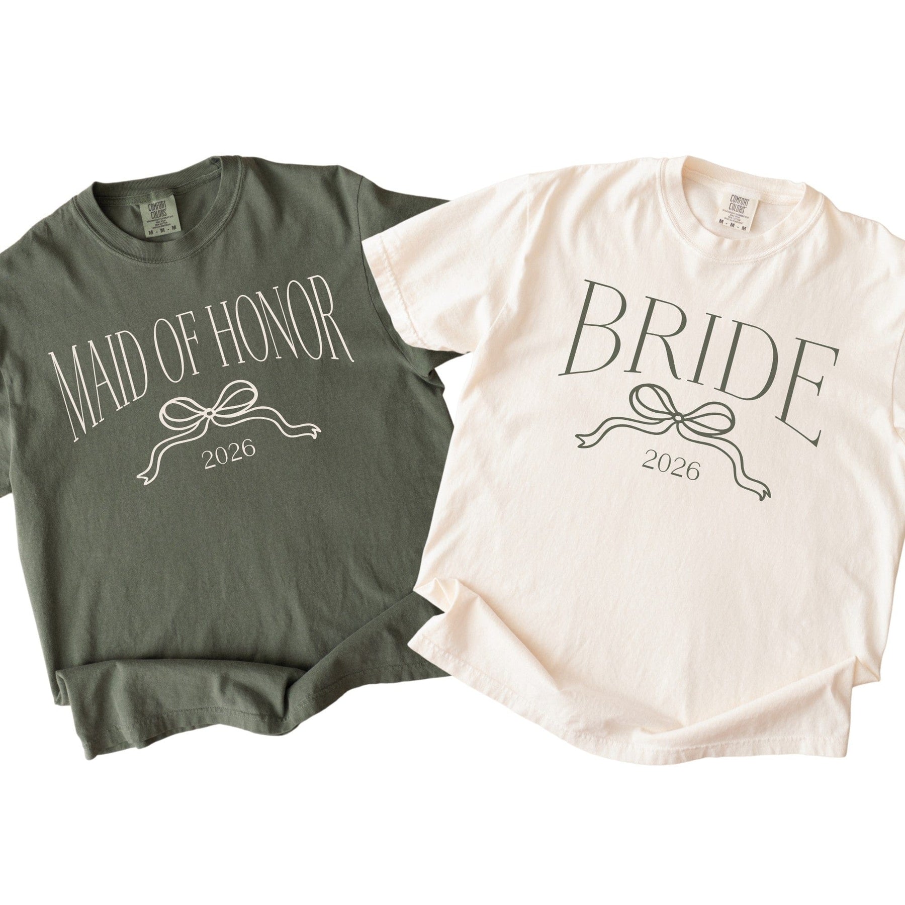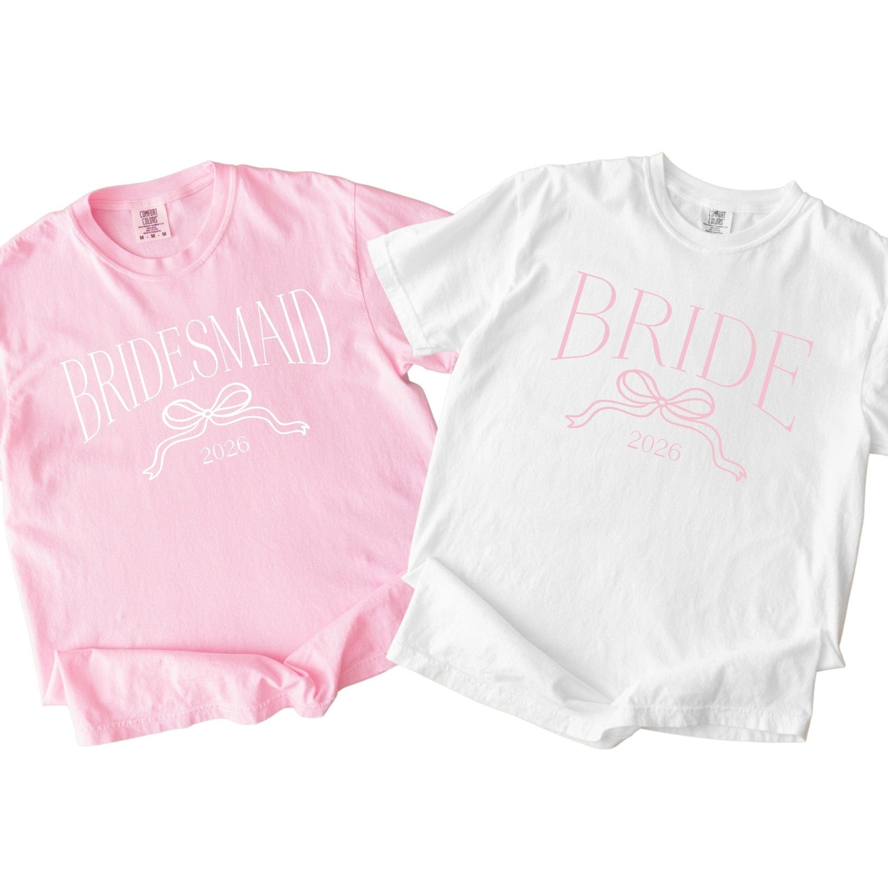 These bow bridal party shirts are printed on premium Comfort Colors 1717 tees and customized with your bridal party title and wedding year.