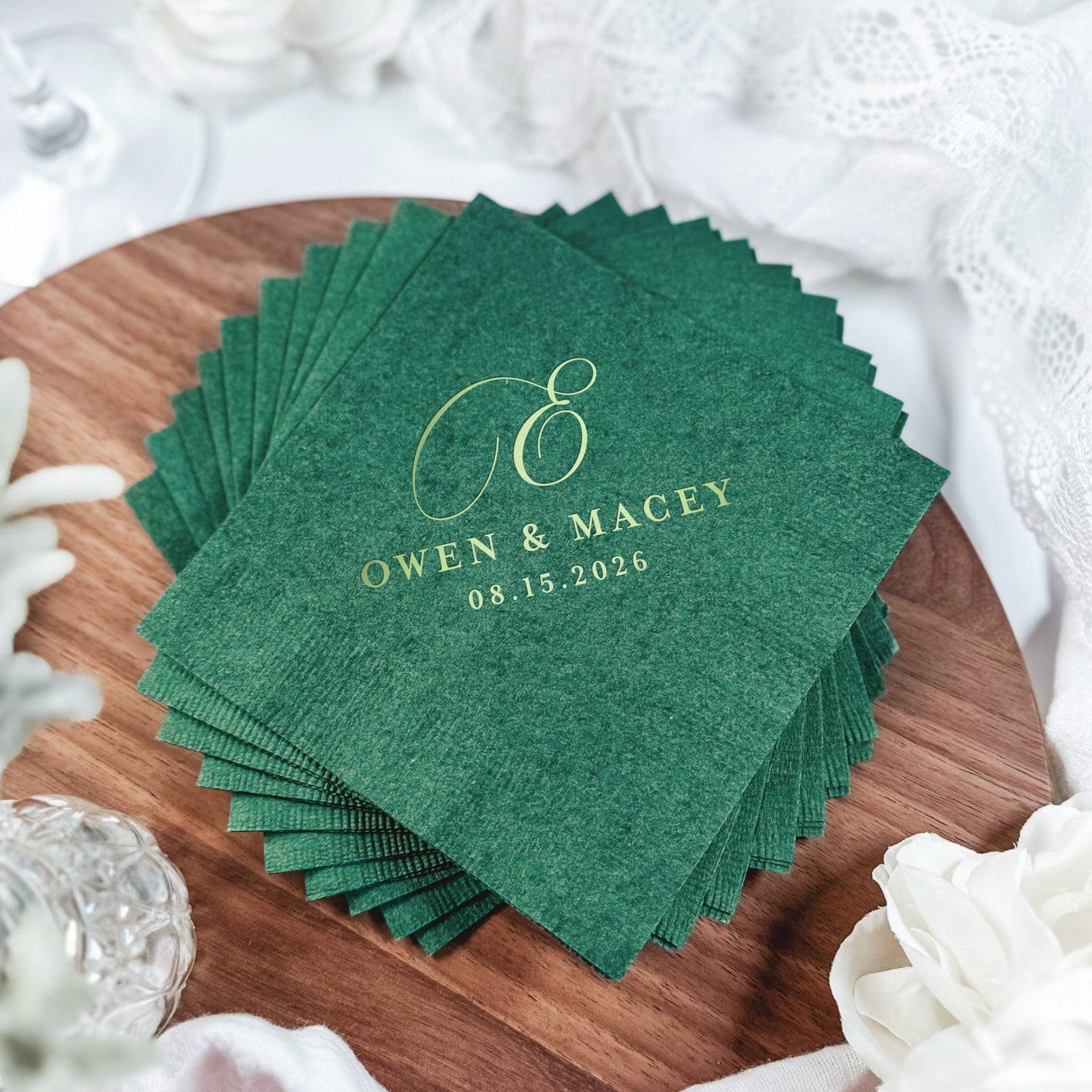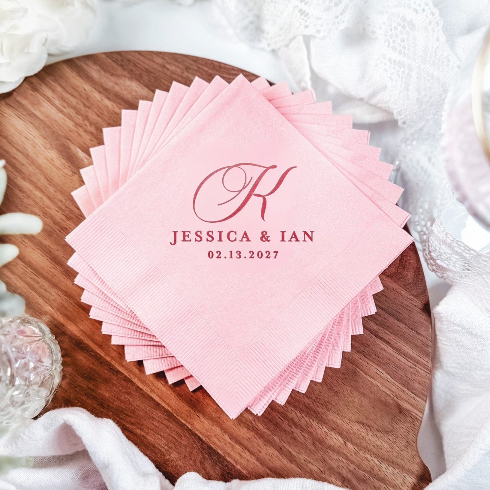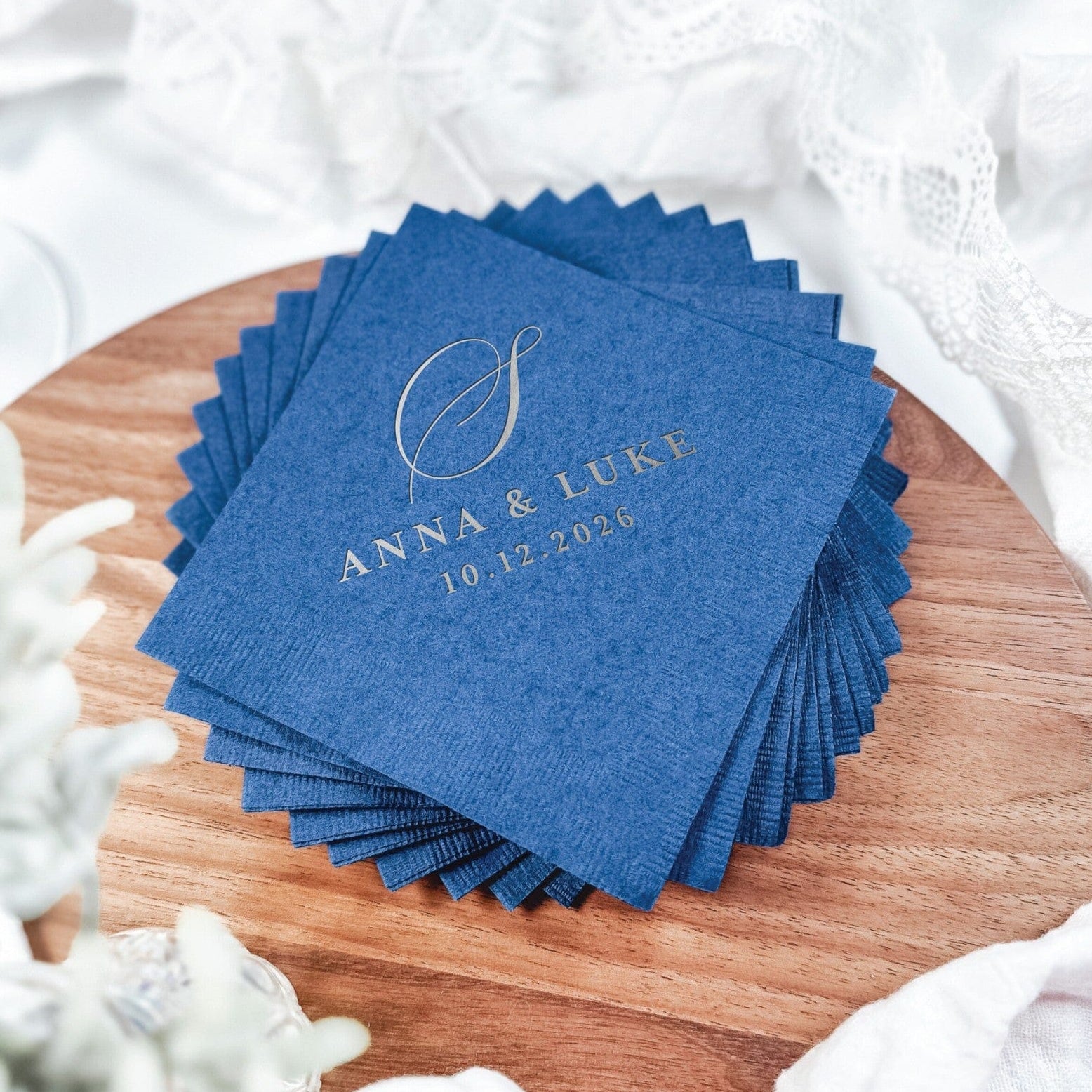 Make a timeless statement with these personalized 3-ply cocktail napkins, designed to add an elegant finishing touch to your wedding celebration. Featuring a refined script monogram paired with classic names and date typography, this design is perfect for couples who appreciate traditional details with a polished, upscale feel. The embossed coined edge and substantial 3-ply construction create a beautiful presentation for cocktail hour, bar service, and reception tables.