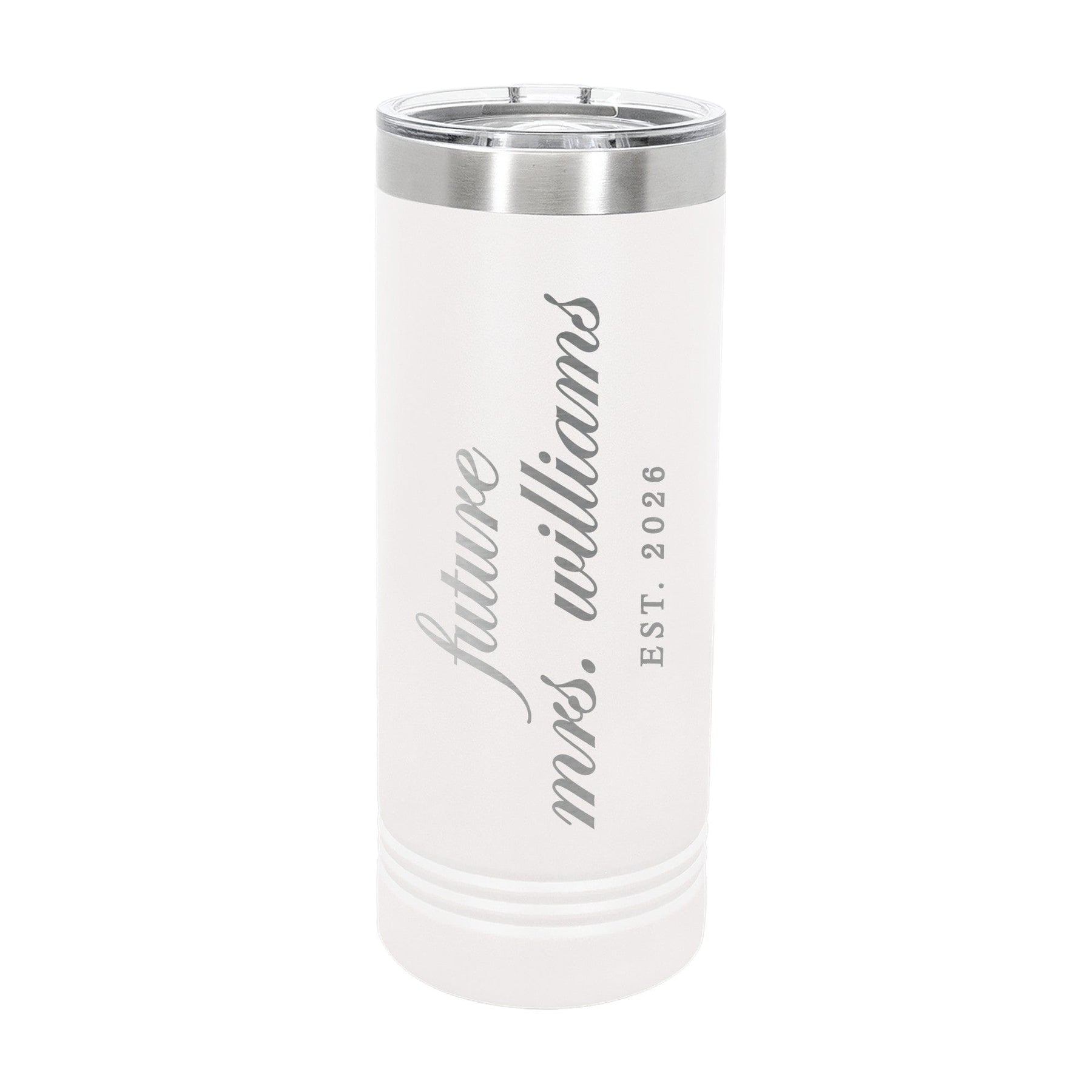 - Personalized Skinny Tumbler – Laser engraved with the same “Future Mrs” design to match her cosmetic bag. Keeps drinks cold or hot for hours, perfect for sipping on the go.