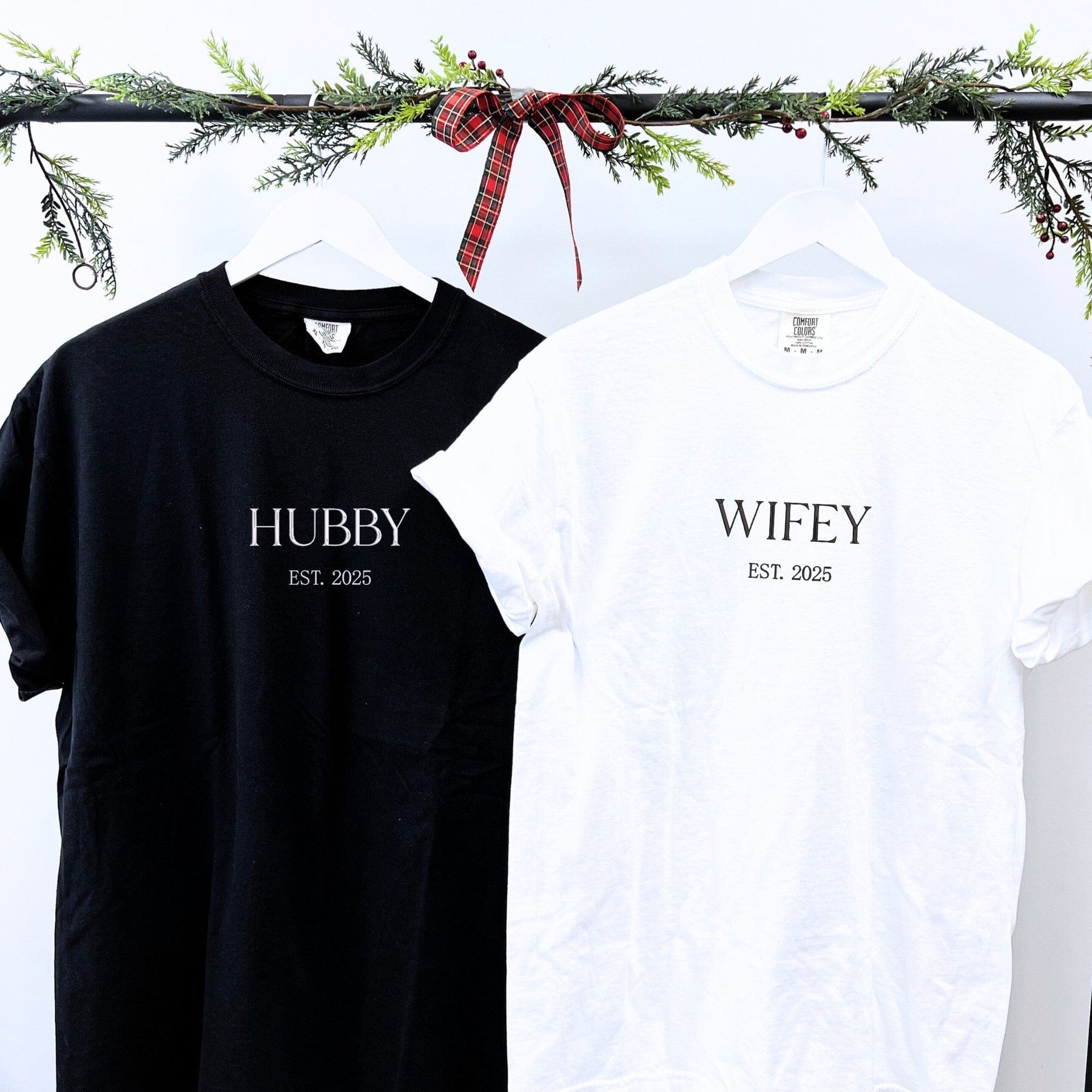 This coordinated duo includes two premium Comfort Colors® tees — one black with HUBBY embroidery and one white with WIFEY embroidery. Each can include an optional EST year for a meaningful, personal touch. A cozy and classic gift for weddings, anniversaries, or newlywed getaways.