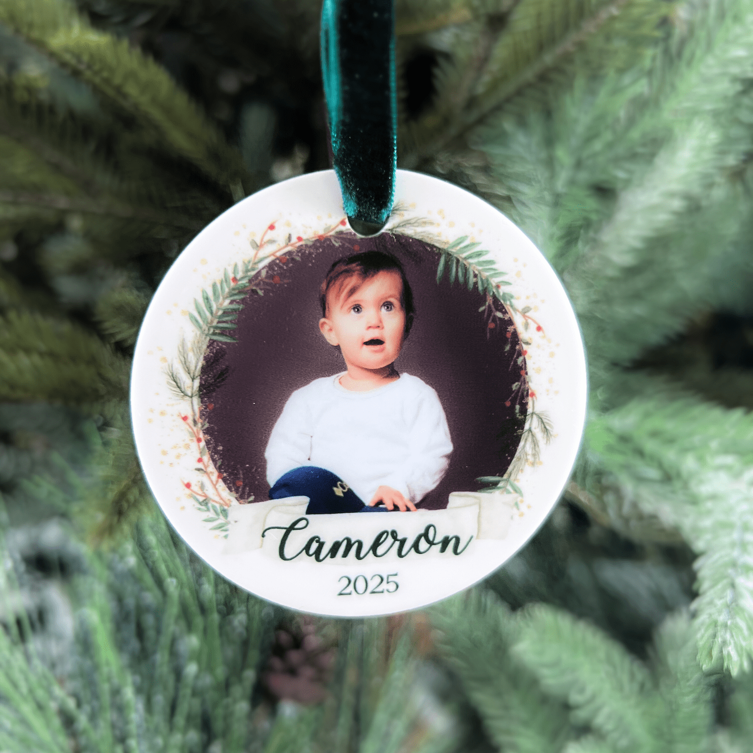 Capture your child’s holiday joy with this personalized acrylic photo ornament. Featuring your child’s photo inside a festive greenery wreath with their name and year, this keepsake makes a perfect addition to your tree or a thoughtful gift for grandparents. Printed directly on durable acrylic for a bright, lasting finish.