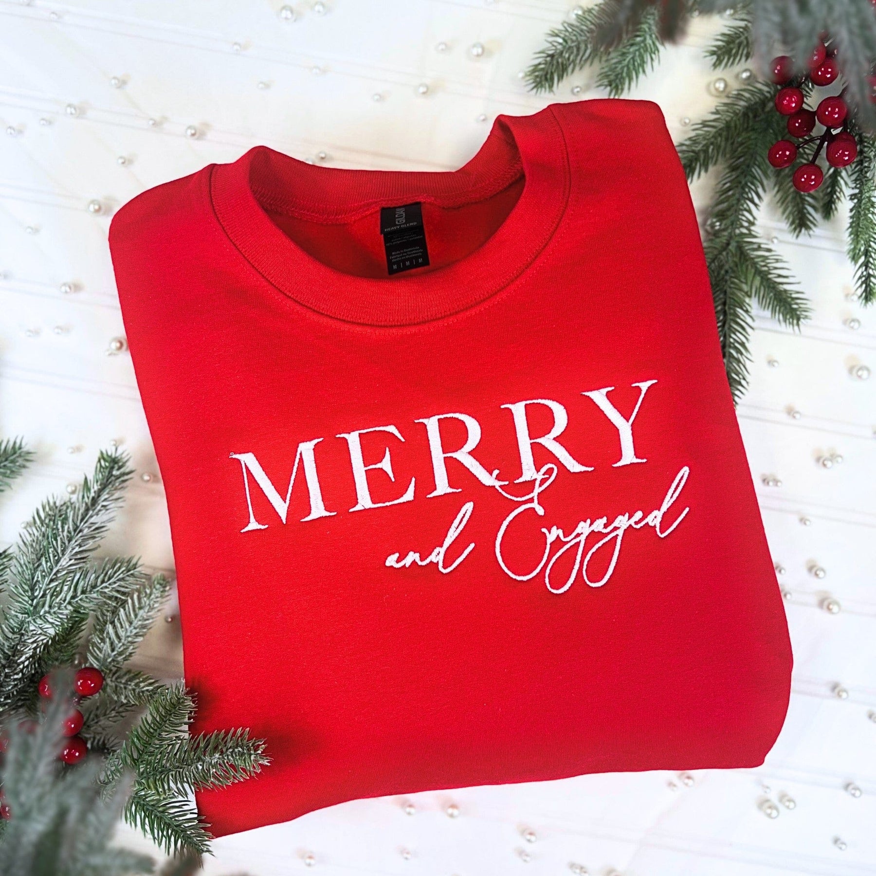 A vibrant red crewneck sweatshirt crafted from a soft fabric, featuring a white graphic design for a winter engagement or holiday celebration, displayed with frosted evergreen branches.