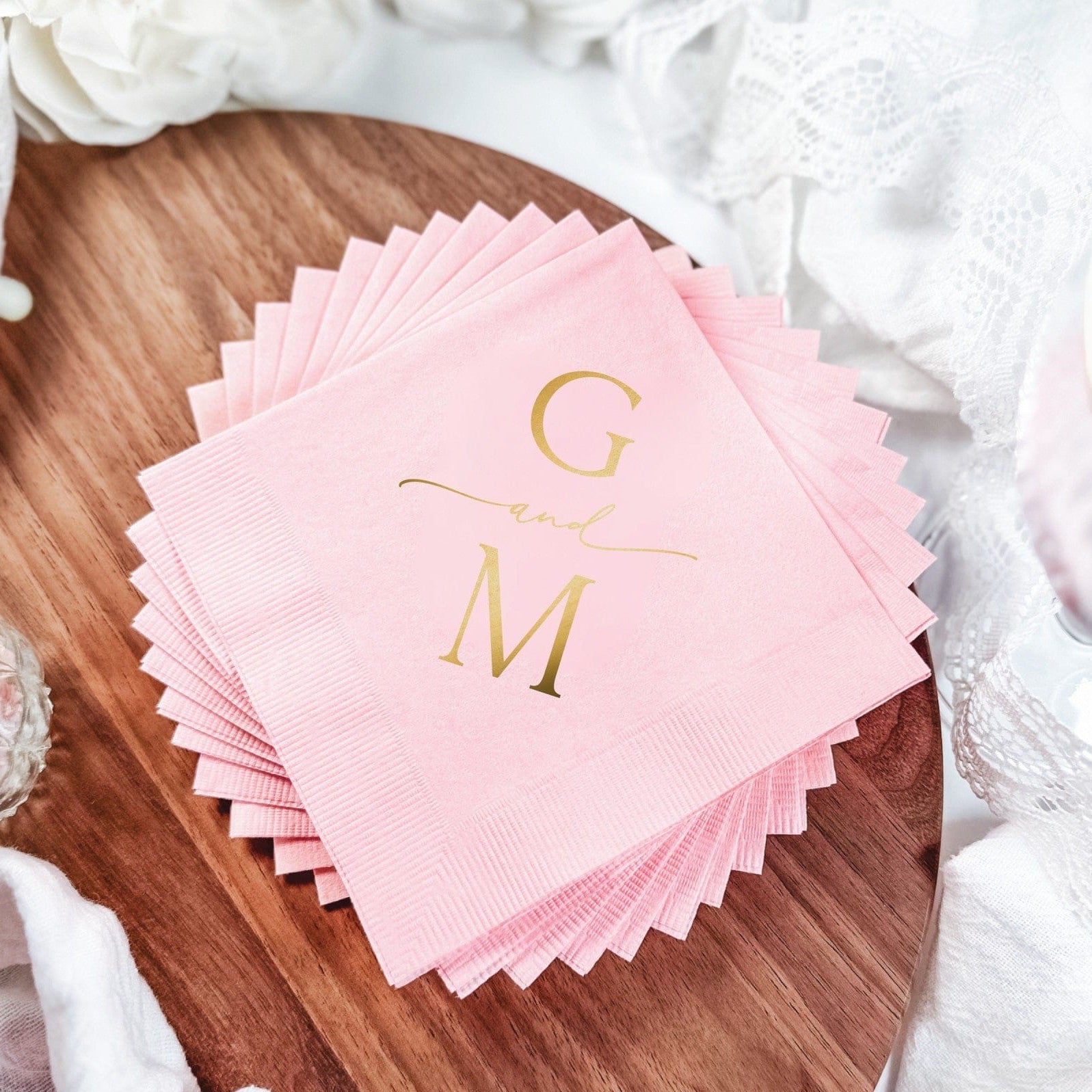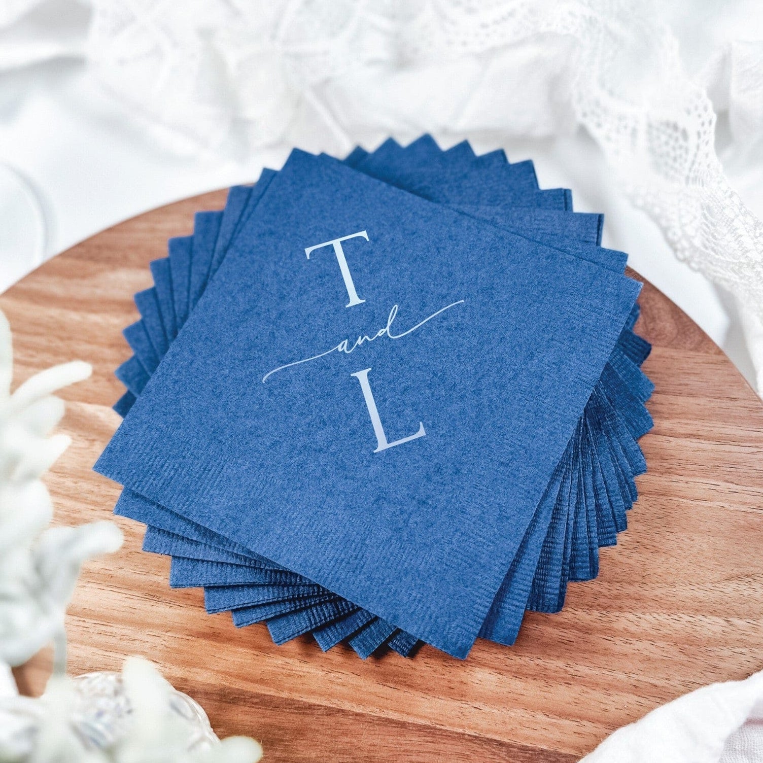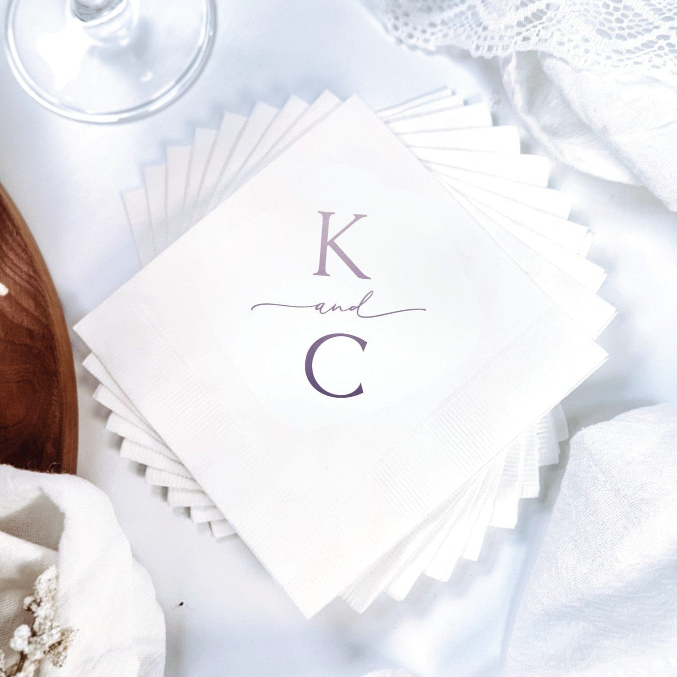 These personalized 3-ply wedding napkins feature a refined, minimalist monogram design with softly styled initials connected by a delicate script detail. Clean typography and balanced spacing create a modern yet timeless look, perfect for couples who love understated elegance. Crafted from premium 3-ply paper and finished with an embossed coined edge, these napkins add a polished touch to reception tables, bar service, and wedding day details.