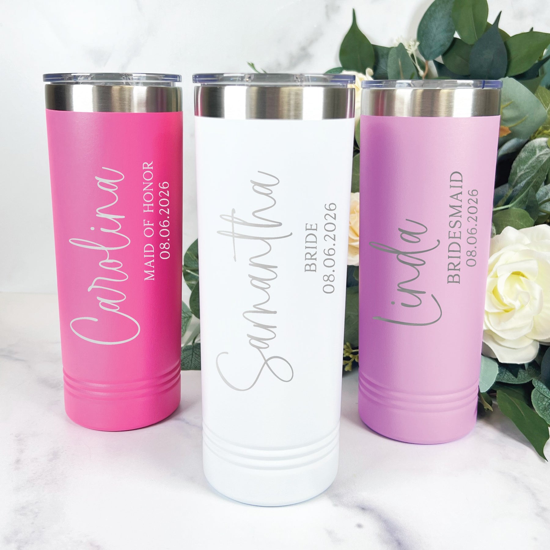 Make your bridal party feel extra special with personalized tumblers featuring their name, title, and your wedding date. These sleek 22oz skinny tumblers are laser engraved—so the design won’t fade, peel, or scratch—and available in stunning bridal-inspired colors like white, blush, and pink.