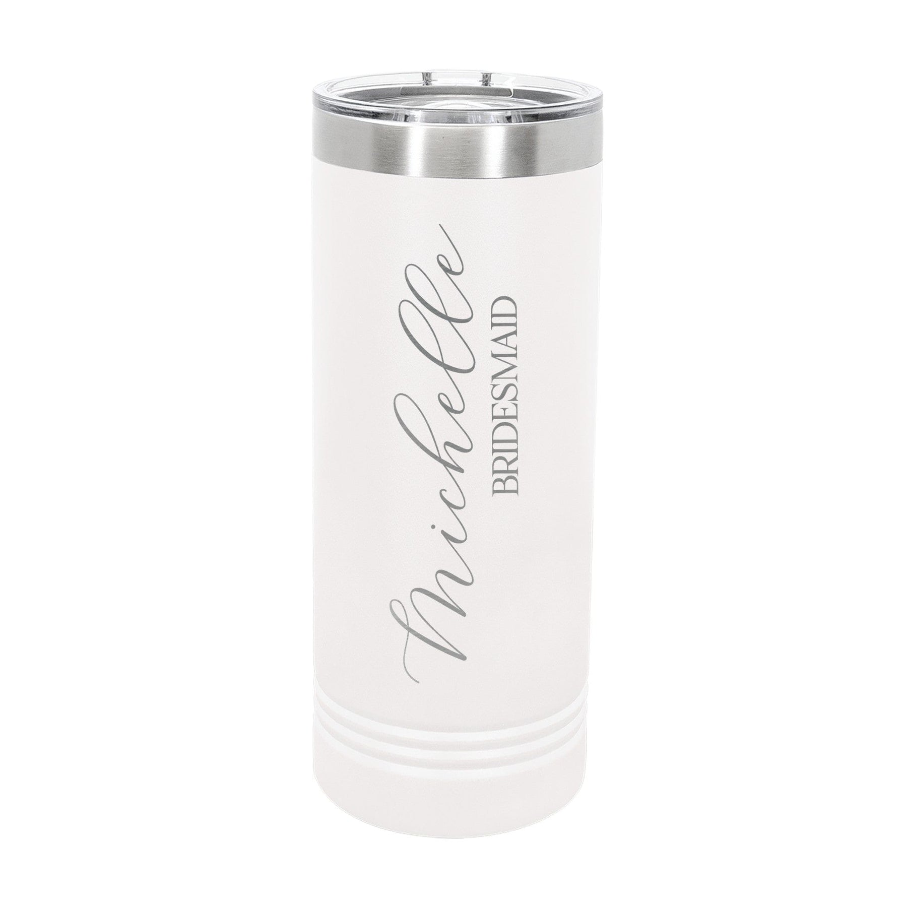 Personalized 22 oz Skinny Tumbler – Double-wall insulated stainless steel keeps drinks hot or cold for hours. Includes a clear slider lid.