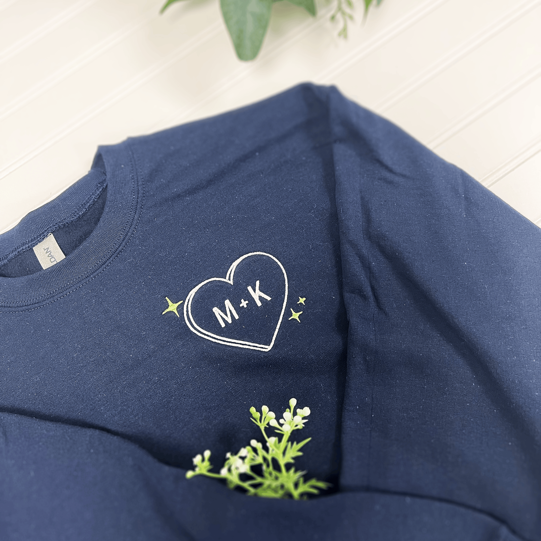 Sweet with a little sass — our custom heart embroidered sweatshirt lets you say exactly what you want inside the heart design. Add your own short phrase, name, or message (up to 5 characters on top and 4 on bottom) to create a personalized piece that’s totally you.