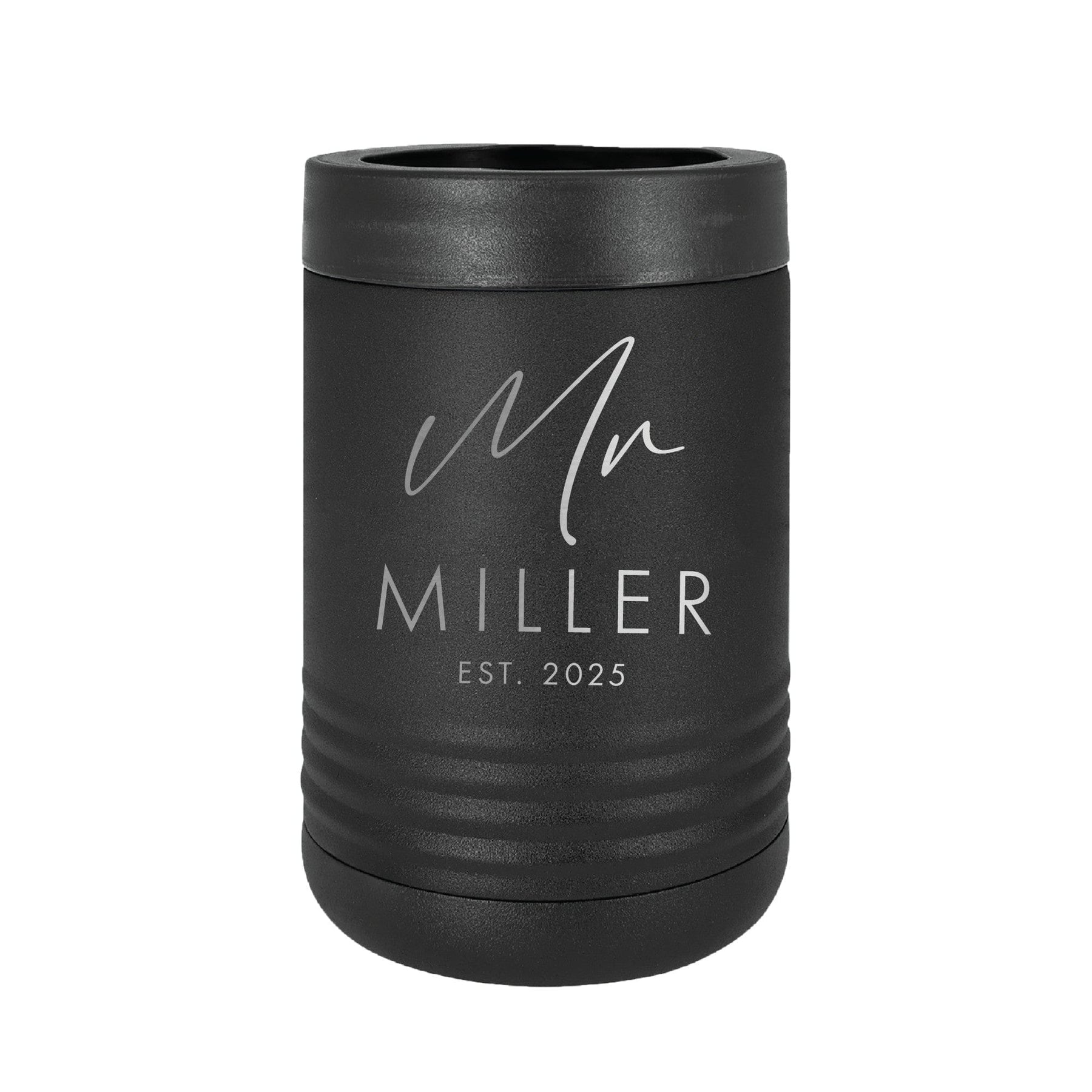 Personalized Standard Can Cooler (His) – Sleek black design with precision engraving. Keeps beverages chilled in durable stainless steel style.