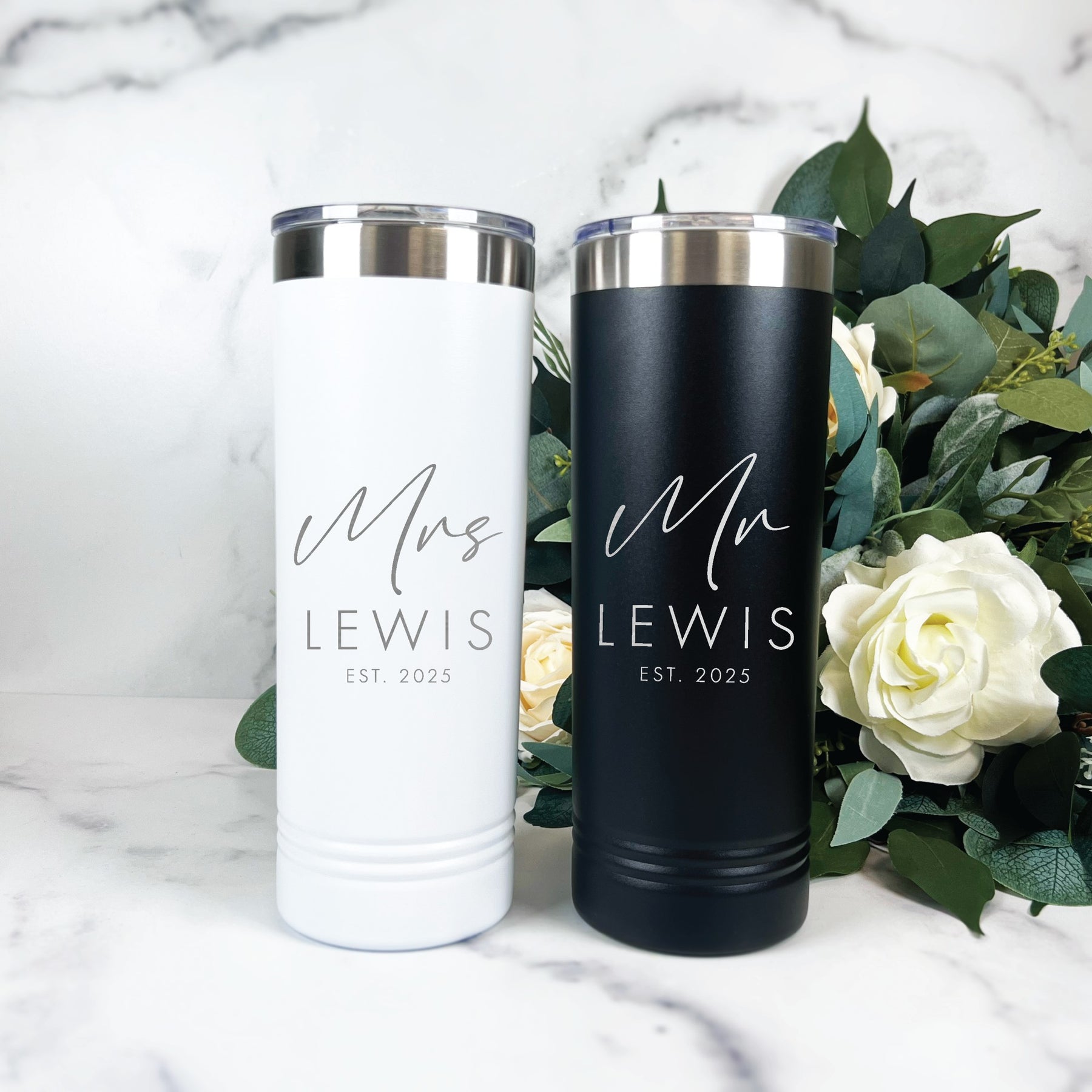 Celebrate your newlywed status in style with this modern Mr. & Mrs. Established tumbler set—personalized with your shared last name and wedding year. Each skinny tumbler is laser engraved (never vinyl) in our Pennsylvania studio for a design that’s permanent, crisp, and beautifully timeless.