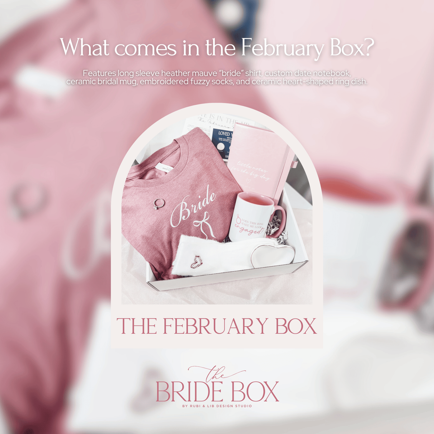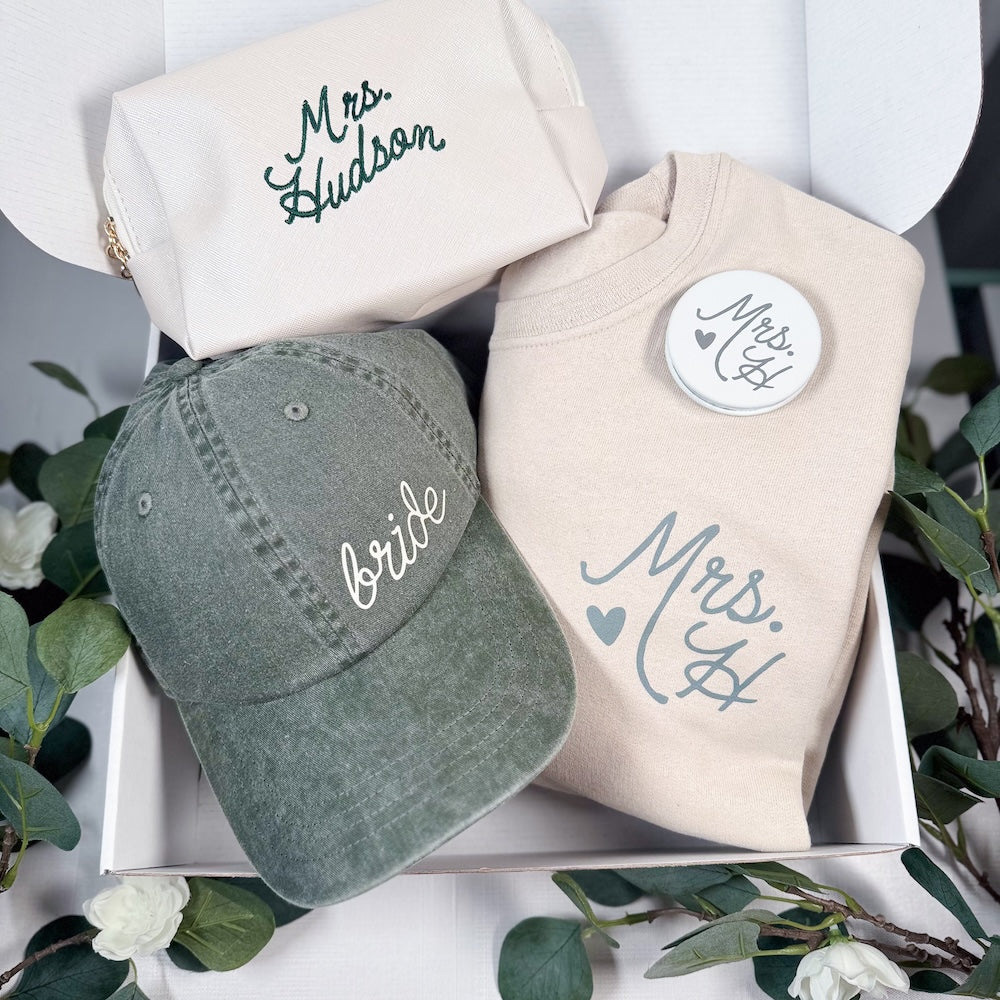 Each Bride Box includes 3–5 curated bridal items hand-selected to match your engagement season and your personalization details. Items vary monthly and may include apparel, drinkware, planning essentials, accessories, or seasonal bridal surprises.