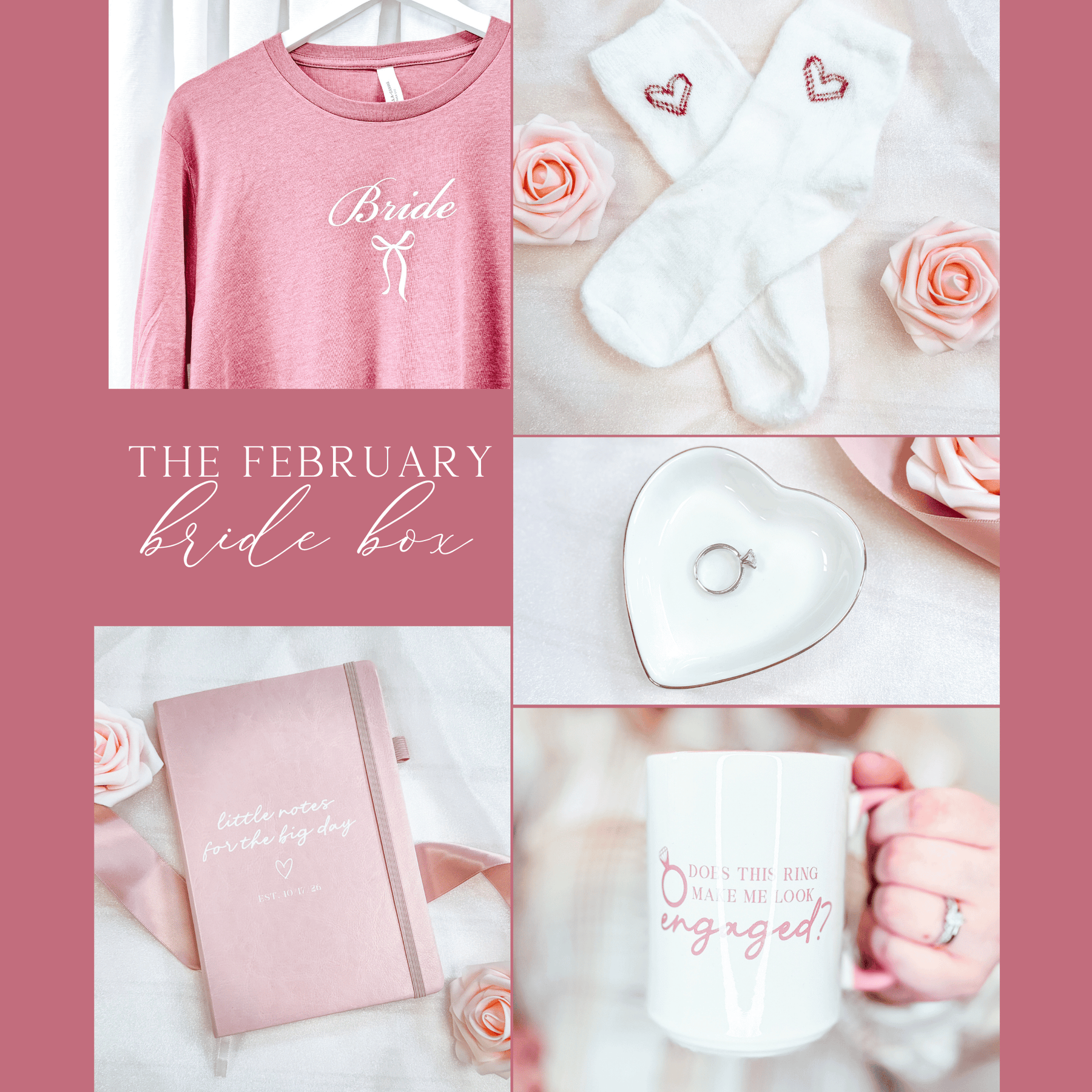 Each Bride Box includes 3–5 curated items selected to celebrate your engagement. Items vary monthly, but may include:
