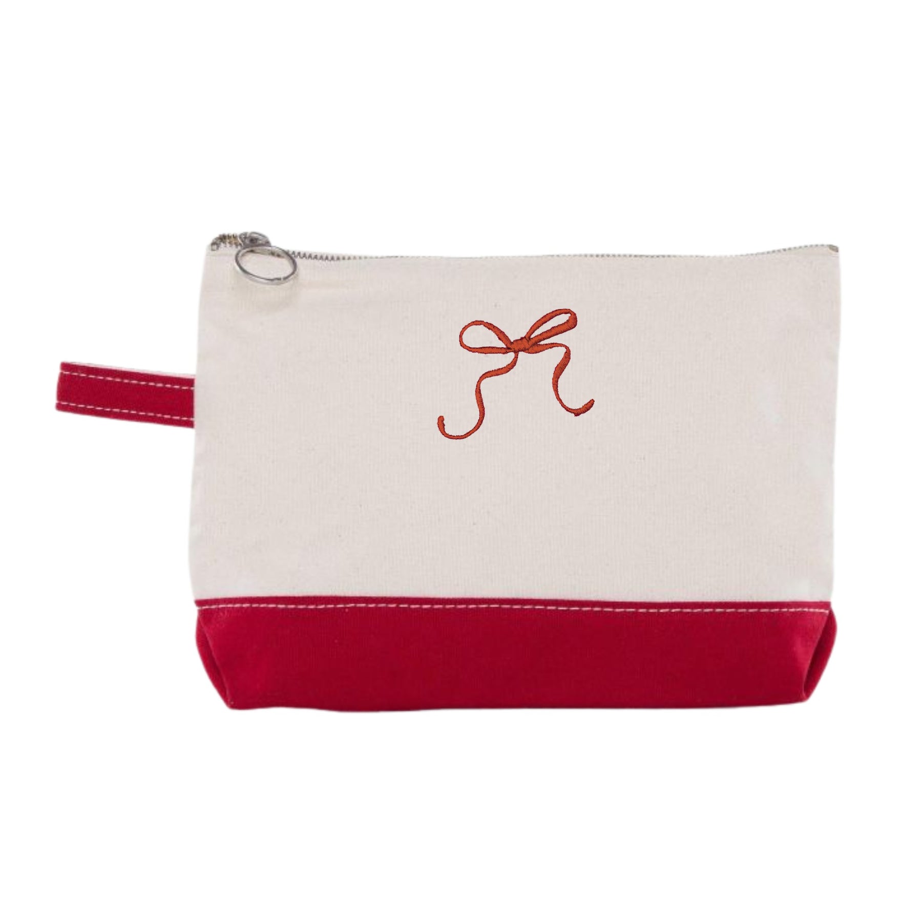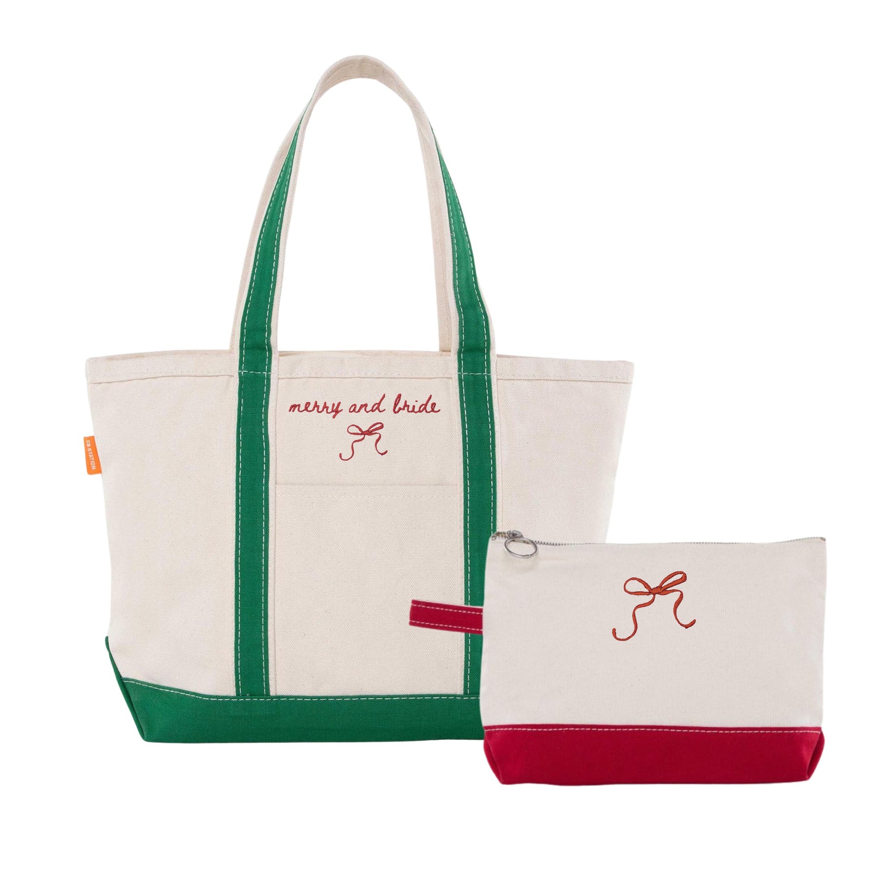 The heavyweight canvas tote features green handles and a deep front pocket embroidered with “merry and bride” in red thread, complete with a dainty bow detail. Paired with a coordinating zipper pouch—ideal for makeup, accessories, or travel essentials—this set is as practical as it is charming.