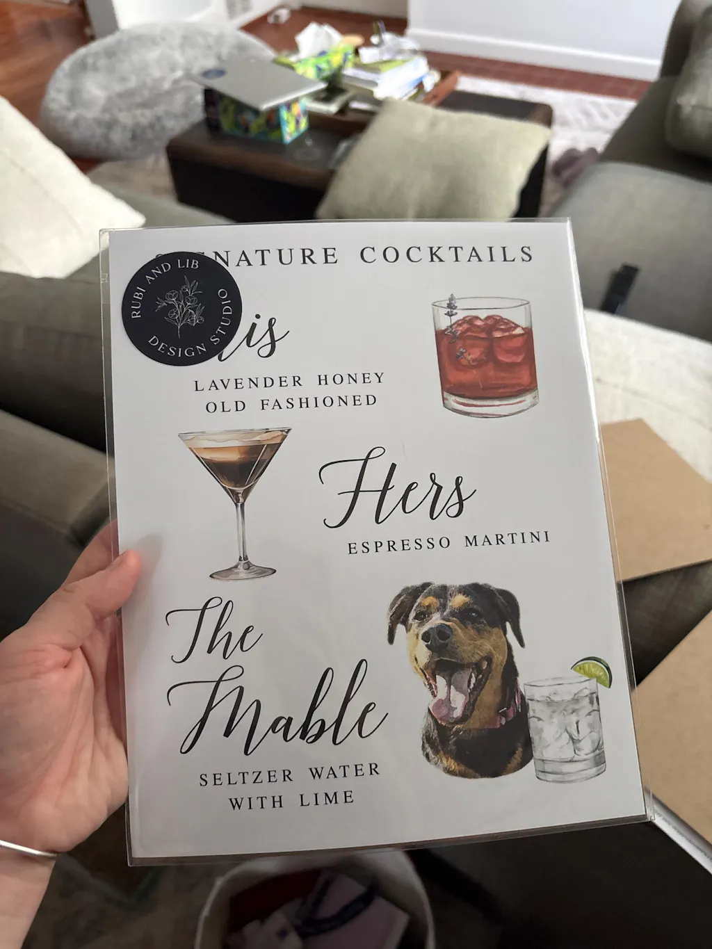 This is a perfect signature drink sign for a wedding or party. Add a special touch and include a likeness of your favorite four legged friend to your wedding reception bar.